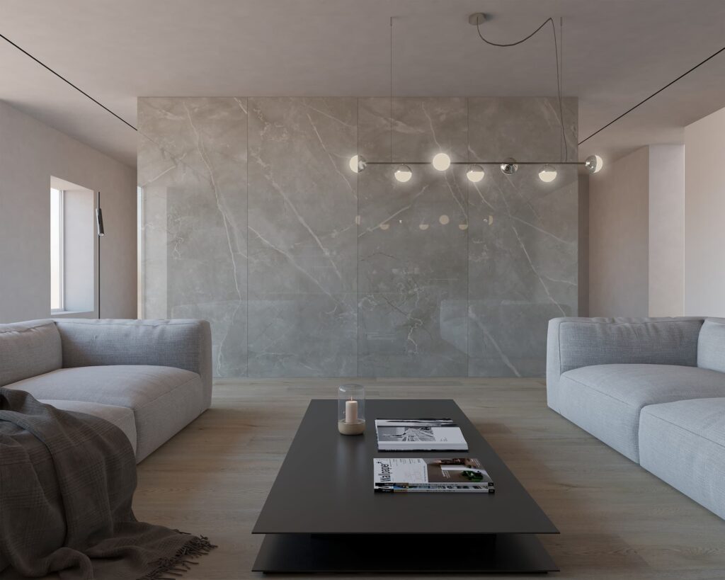 Un rivestimento dal carattere nordico che interpreta il grigio nella sua versione più fredda e minerale. La tonalità glaciale trasmette pulizia visiva e modernità assoluta, creando spazi dall'estetica rigorosa e contemporanea.